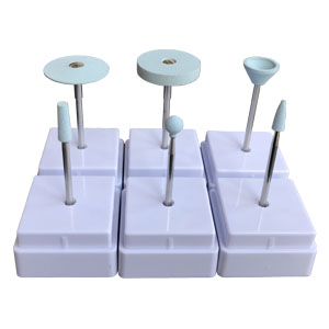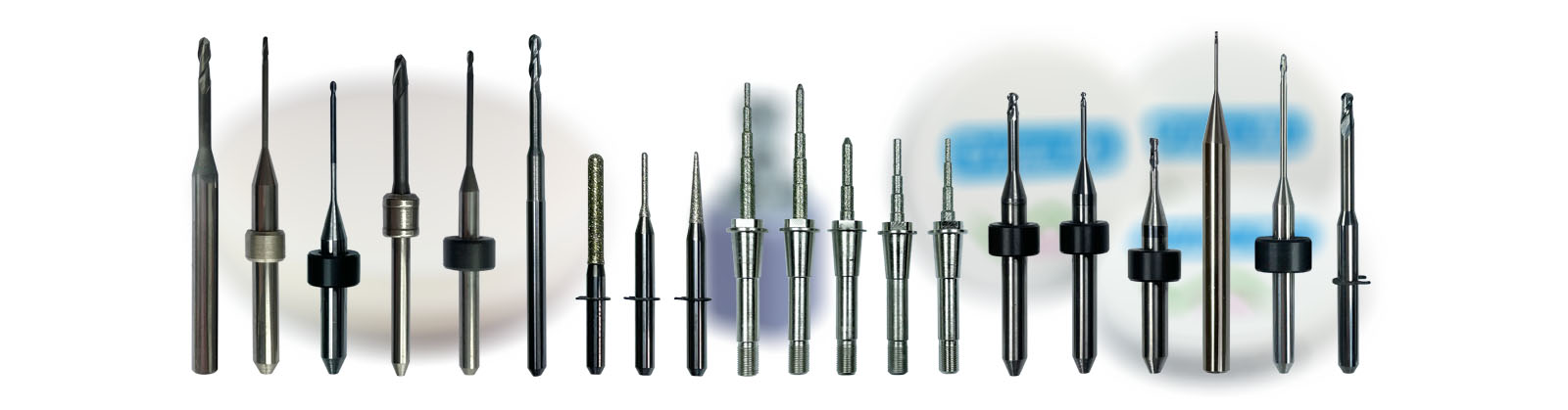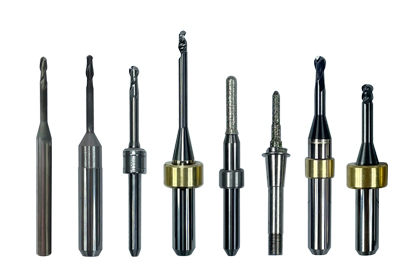 Various cadcam milling burs for zirconia, pmma, wax, peek, lithium disicilicate and metal alloy.